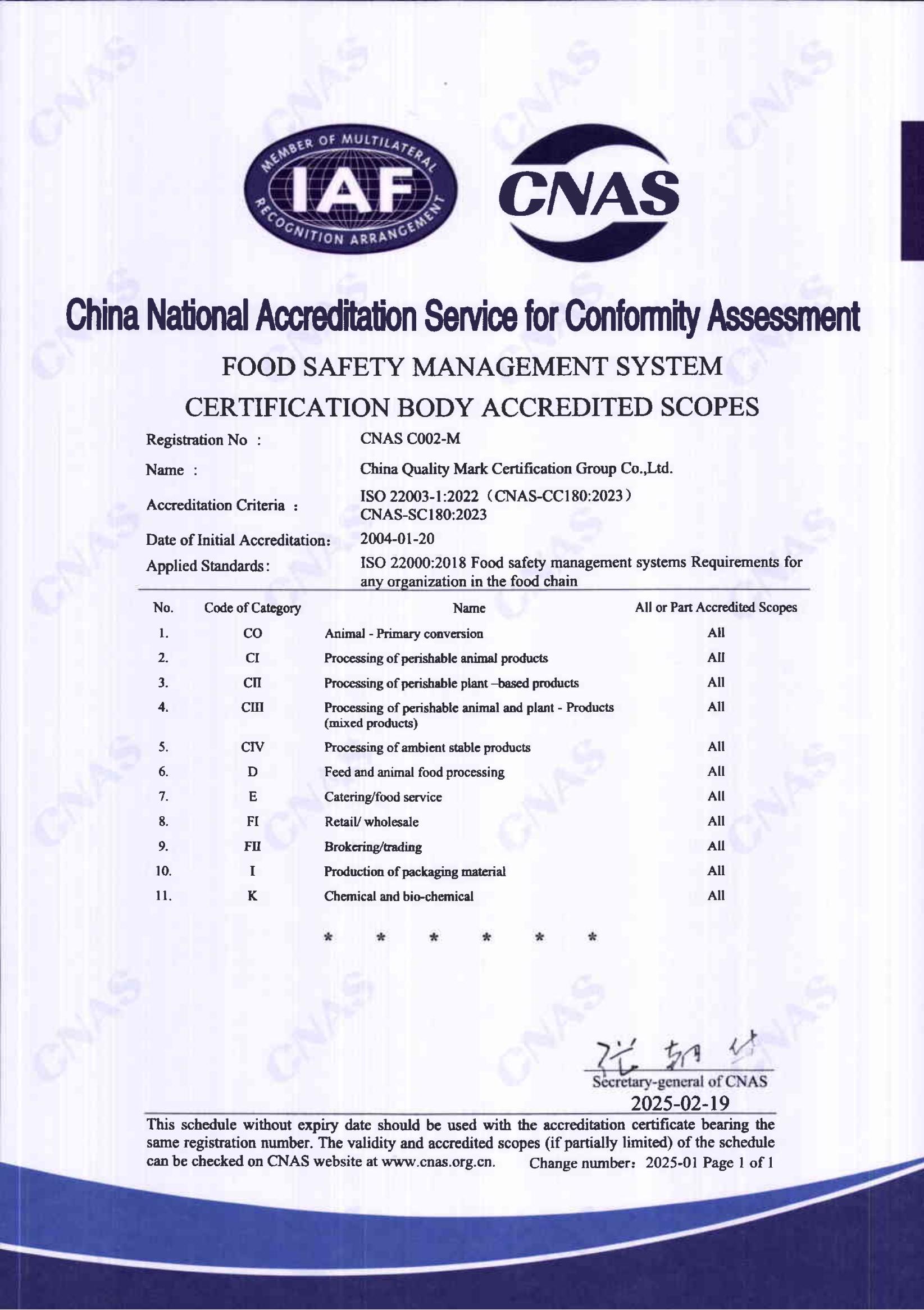 食品安全管理體系認可證書