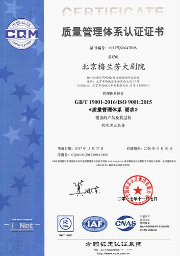 方圓集團為梅蘭芳大劇院頒發(fā)新版質(zhì)量管理體系認證證書