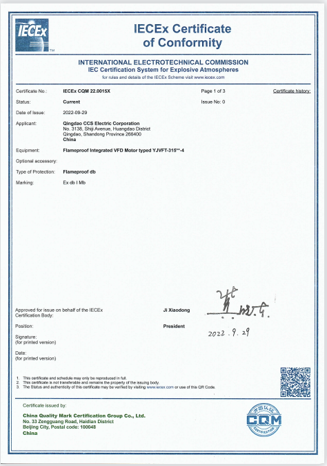 2019年,方圓集團獲得國際組織認可,順利取得國際電工委員會電工產品合格測試與認證組織(IECEE)CB體系的國家認證機構(NCB)資質,成為同時具備國際電工委員會防爆電氣安全體系(IECEx)、國際電工委員會電工產品合格測試與認證組織(IECEE)CB體系的雙資質認證機構。作為雙資質認證機構,方圓為對標國際先進標準的高品質產品提供技術保障,充分發揮國內合格評定機構的責任擔當。作為IECEx國內分秘書處,2021年,方圓組織IEC合格評定體系國內技術機構完成了IECEx體系I類礦用防爆電氣產品范圍確認;在中德合格評定合作工作組框架下,基于IECEx互認機制,方圓與德方機構簽署了《方圓防爆CCC電氣產品與CE(ATEX)認證的互認協議》,實現兩種制度間認證結果的互認轉換,促進了我國檢測認證結果得到更廣泛的國際認可,助力防爆電氣生產企業“走出去”。今年9月,方圓集團為國內某防爆電氣生產企業的礦用隔爆型變頻調速一體機簽發了IECEx礦用設備認證證書,這是中國國家成員機構(認監委)2021年決策確認IECEx礦用設備認證范圍以后,由本土機構簽發的第一張IECEx礦用設備認證證書。