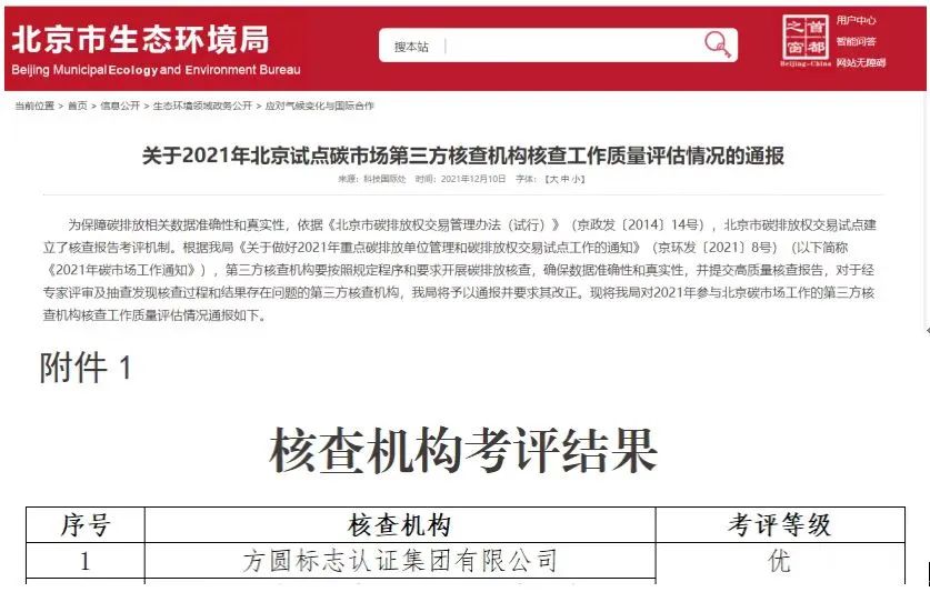 在北京市碳核查機構考評中方圓標志認證集團連續3年獲評“優”級且綜合排序第一名
