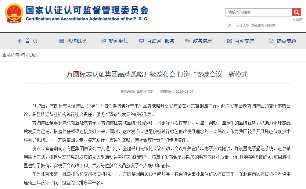 國家認監委官網刊發《方圓標志認證集團品牌戰略升級發布會 打造“零碳會議”新模式》