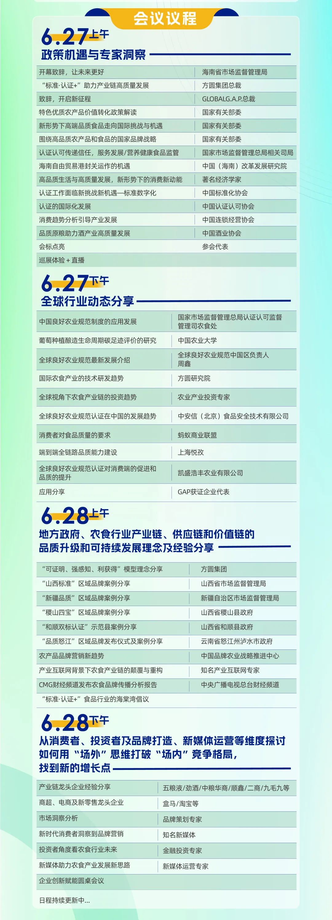 本次論壇的主題是“新征程 新未來”,論壇以國際組織GLOBALG.A.P中國日為背景,充分發揮海南自貿港的國際化平臺作用,以“標準•認證+”為手段,助力產業鏈高質量發展,旨在為全產業鏈的參與者搭建共享、共創、共贏的交流平臺。通過分享前沿技術發展趨勢和市場洞察、探討研究先進技術和管理標準、以及從資本、品牌、新消費的視角助力行業發展、展示和觀摩優良實踐案例、開展深層學術交流等方式,共同推動行業產業鏈、供應鏈和價值鏈的品質升級和可持續發展,實現產業高質量發展。