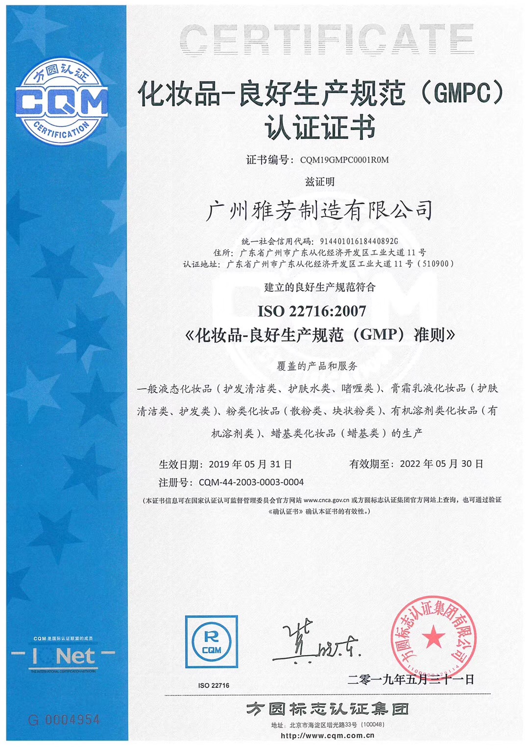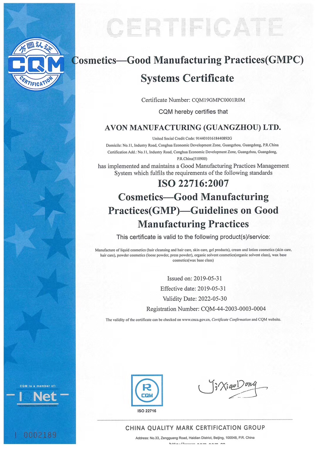 熱烈慶祝方圓廣東公司為優質客戶廣州雅芳制造頒發首張ISO22716:2007化妝品良好生產規范(GMPC)的認證證書