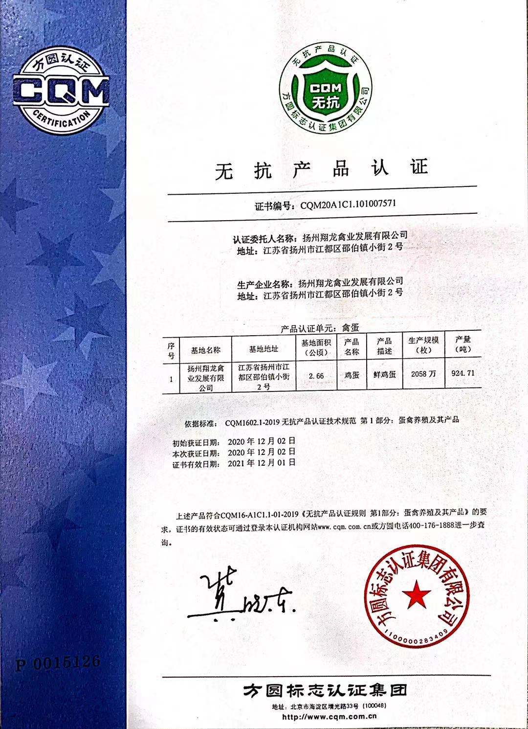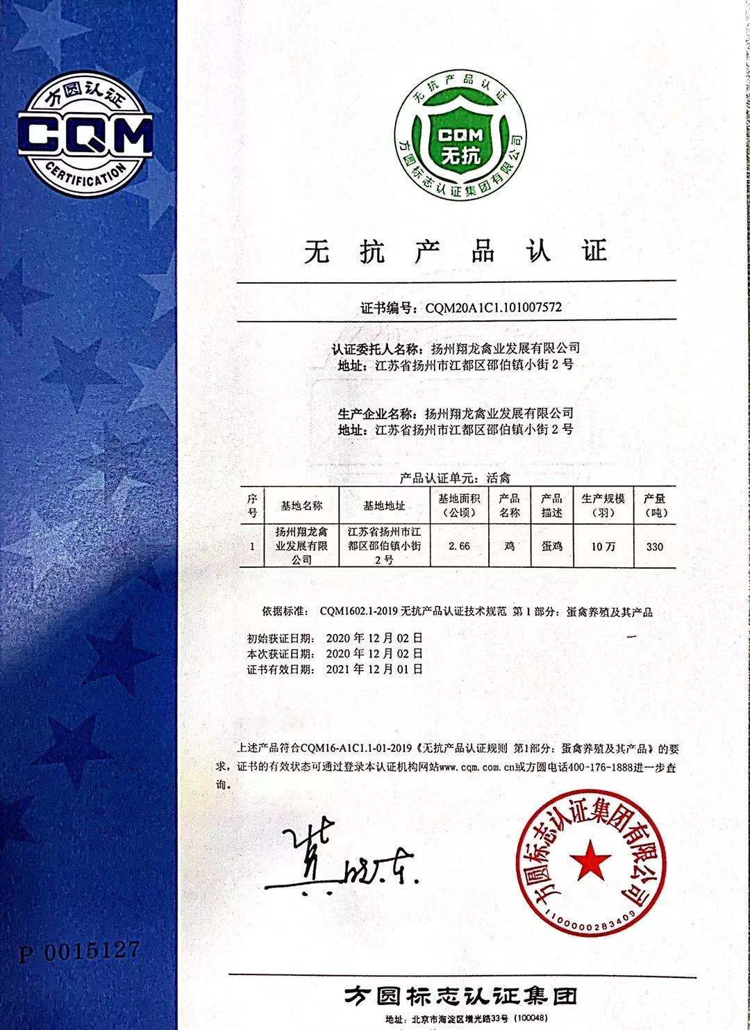 時間:2020年12月08日 2020年12月02日,方圓浙江公司為揚州翔龍禽業發展有限公司頒發了蛋雞和鮮雞蛋兩個產品的無抗產品認證證書,這是浙江公司頒出的首張無抗產品認證證書。