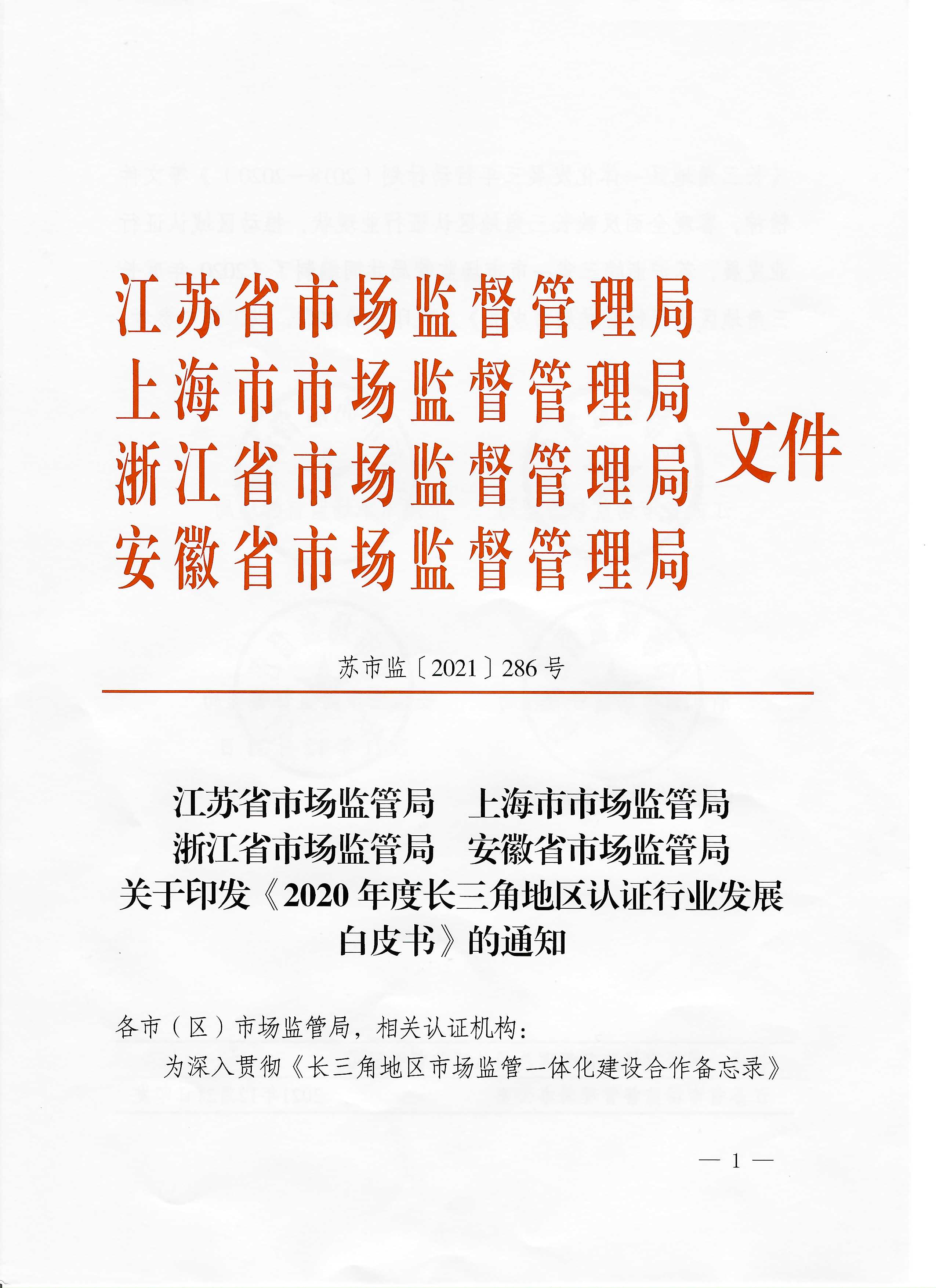 時間:2021年12月27日 2021年12月21日,江蘇省市場監督管理局、上海市市場監督管理局、浙江省市場監督管理局和安徽省市場監督管理局聯合印發了《關于印發〈2020年度長三角地區認證行業發展白皮書〉的通知》(蘇市監〔2021〕286號)。