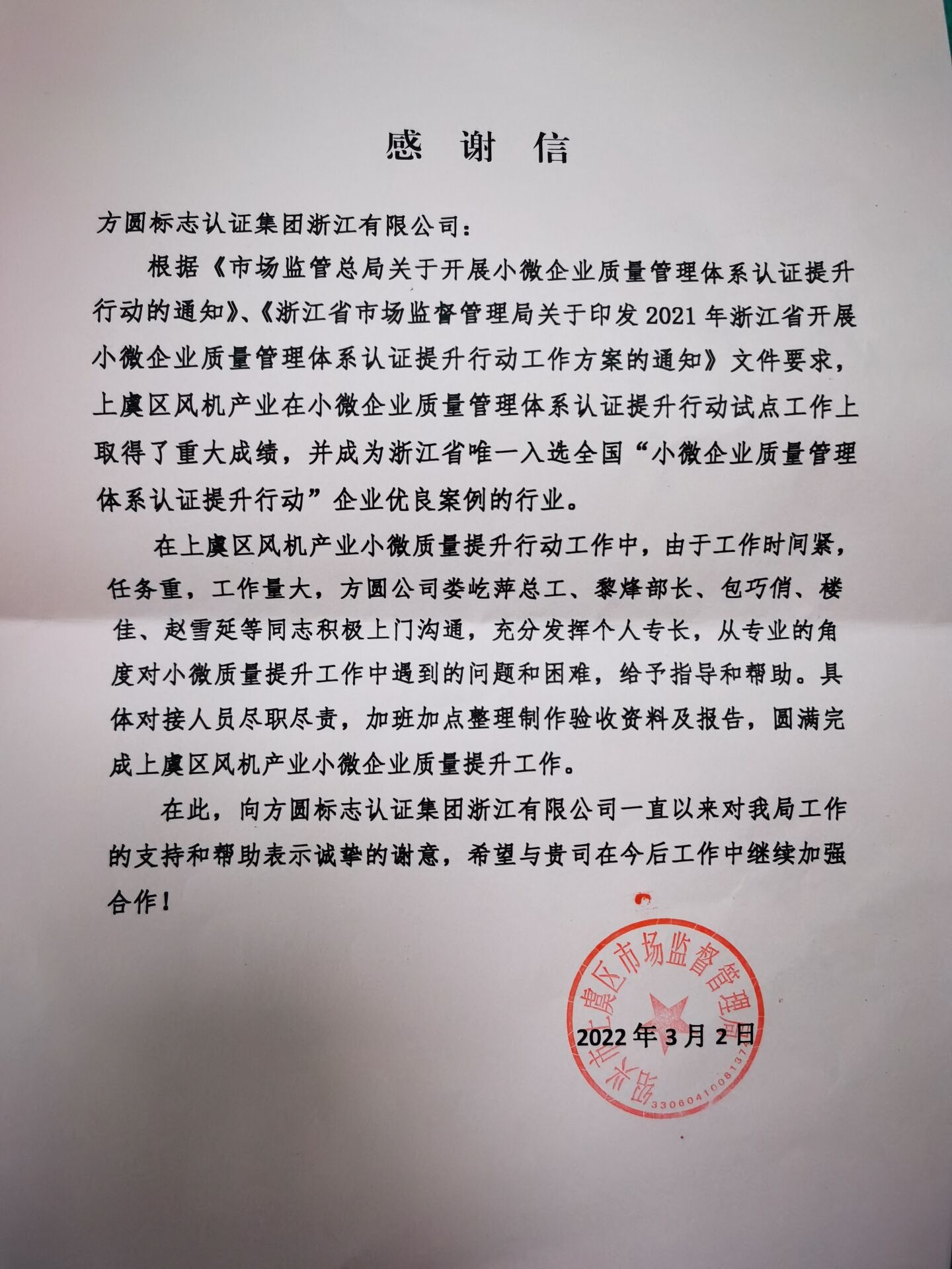 新年伊始,陽春三月,上虞區市場監督管理局特發“感謝信”一封,表揚此項目中辛勤付出的方圓認證浙江公司的各位同仁。喜樂有分享,責任有擔當,方圓浙江公司將矢志不渝地做好浙江小微企業質量提升的堅強后盾。