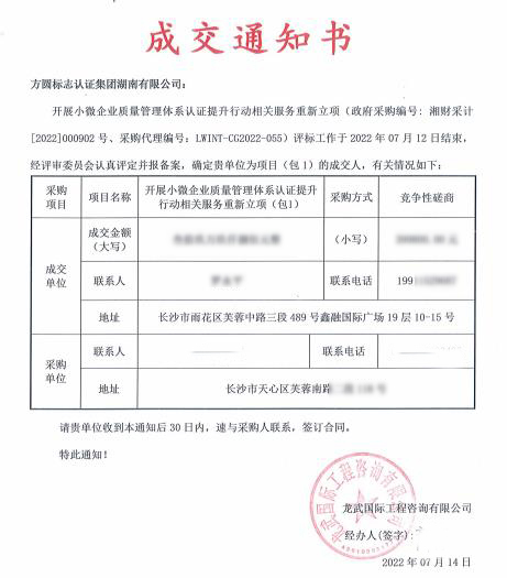 方圓湖南公司成功中標湖南省市場監督管理局小微企業質量管理體系認證提升行動相關服務項目