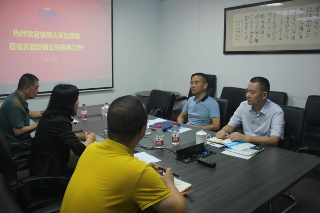 劉險鋒總經理代表方圓安徽公司對劉春生處長的到來表示了歡迎,同時對安徽省“十四五”規劃的內容提出了初步的想法與建議。劉總表示,方圓安徽公司背靠集團,在安徽地區扎根多年,在市場監督管理局的正確領導下,在方圓集團的大力支持下,一定發揮自身優勢,對安徽的認證認可工作扎實開展和深入推進給予全力配合。