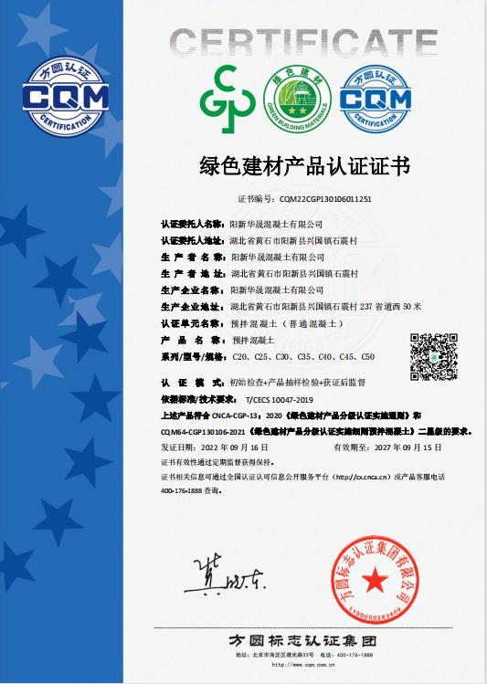陽新華晟混凝土有限公司是黃石市生產預拌混凝土的代表性企業之一,企業在通過綠色生產評審后,基于自我更高要求及為外部提供信任的需求,向方圓認證提出了對預拌混凝土(普通混凝土)產品進行綠色建材產品認證的申請。