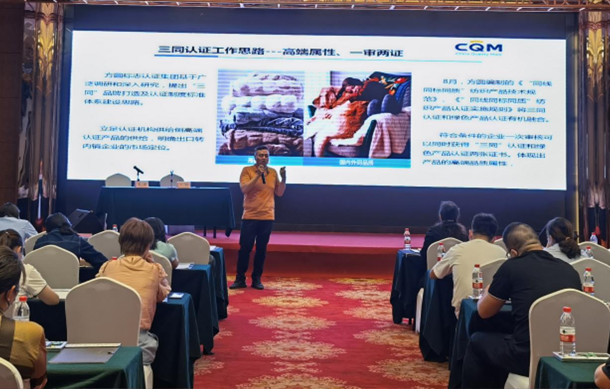 南通市市場監管局以“推動質量變革創新,促進質量強市建設”為主題,開展了南通家紡產業質量提升專題活動。方圓江蘇公司客服培訓部部長王冉圍繞“三同認證工作思路——高端屬性、一審兩證”做了專題培訓,并為當地首批“三同”獲證企業頒發了三同認證證書。
