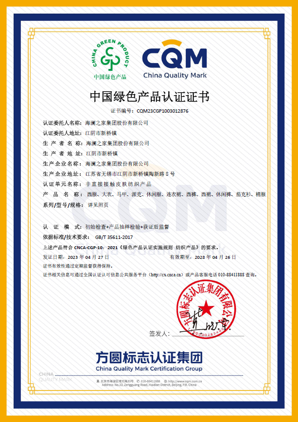 近日,方圓江蘇公司向海瀾之家集團股份有限公司頒發《中國綠色產品認證證書》,獲證產品共計兩個產品單元:非直接接觸皮膚紡織產品和直接接觸皮膚紡織產品,這是無錫市首張紡織行業綠色產品認證證書。